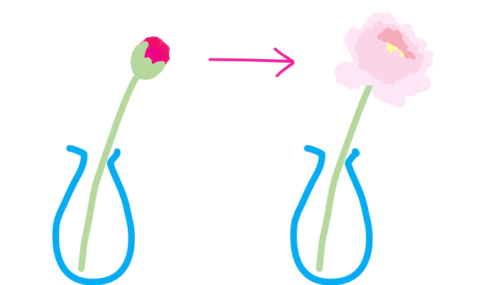 Houd er rekening mee dat een bloem die nog in de knop zit (e.g. pioenen, rozen, etc.) veel groter kan worden als ze opengaat.